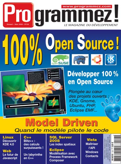 Dans programmez! PDF n° 106 Paru le 01/03/2008 S'ABONNER Outils SonarJ et Maven surveillent votre architecture Java Lire la suite de SonarJ et Maven surveillent votre architecture Java Evénement TechDays 2008 : c’est parti pour Windows Server 2008 ! Lire la suite de TechDays 2008 : c’est parti pour Windows Server 2008 ! Projets Eclipse Process Framework Composer Lire la suite de Eclipse Process Framework Composer SGBD Les bases de données légères Lire la suite de Les bases de données légères L’usine à build et les bases de données Lire la suite de L’usine à build et les bases de données Gros Plan Model Driven, quand le modèle pilote le code Lire la suite de Model Driven, quand le modèle pilote le code L’approche MD Lire la suite de L’approche MD Introduction au Domain Specific Language Lire la suite de Introduction au Domain Specific Language Concilier Spring et MDA Lire la suite de Concilier Spring et MDA Dossier 100% Open Source Lire la suite de 100% Open Source Carrière THE CODING MACHINE : s’inspirer du modèle open source Lire la suite de THE CODING MACHINE : s’inspirer du modèle open source Développement Web Le futur de Javascript Lire la suite de Le futur de Javascript Code A la découverte de KDE 4 ! Lire la suite de A la découverte de KDE 4 ! Une structure de données fascinante : programmer un labyrinthe en C++ Oui Lire la suite de Une structure de données fascinante : programmer un labyrinthe en C++ Blitz++ et la méta-programmation C++ Lire la suite de Blitz++ et la méta-programmation C++ Maîtriser la nouvelle API Windows Contacts de Vista Oui Lire la suite de Maîtriser la nouvelle API Windows Contacts de Vista