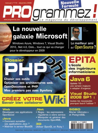 Dans programmez! PDF n° 114 Paru le 01/12/2008 S'ABONNER Actus Visual Studio 2008 et .Net3.5 SP1pour les développeurs Lire la suite de Visual Studio 2008 et .Net3.5 SP1pour les développeurs Projets Le Model Driven Testing Lire la suite de Le Model Driven Testing Travailler en équipe, les outils du succès Lire la suite de Travailler en équipe, les outils du succès Carrières Epita, l’école d’ingénieurs informaticiens labellisée Lire la suite de Epita, l’école d’ingénieurs informaticiens labellisée Transformer des ingénieurs en consultants métier Finance Lire la suite de Transformer des ingénieurs en consultants métier Finance Dossier PHP par la pratique Lire la suite de PHP par la pratique Evénements Microsoft, une nouvelle galaxie Lire la suite de Microsoft, une nouvelle galaxie Code Facebook : soyez OpenSocial Lire la suite de Facebook : soyez OpenSocial Ultimate++ et les bases de données Lire la suite de Ultimate++ et les bases de données Génération de documents en images Lire la suite de Génération de documents en images Health Monitoring : le journal à surveiller Lire la suite de Health Monitoring : le journal à surveiller Utilisation et exploitation des expressions régulières en .Net Lire la suite de Utilisation et exploitation des expressions régulières en .Net Optimisation de la bande passante et messaging temps réel avec BlazeDS Lire la suite de Optimisation de la bande passante et messaging temps réel avec BlazeDS Programmer OpenGL avec le langage Ruby Lire la suite de Programmer OpenGL avec le langage Ruby Java 6 Update 10 : en attendant Java 7 Lire la suite de Java 6 Update 10 : en attendant Java 7 Déconnectez vos applications avec Google Gears Lire la suite de Déconnectez vos applications avec Google Gears