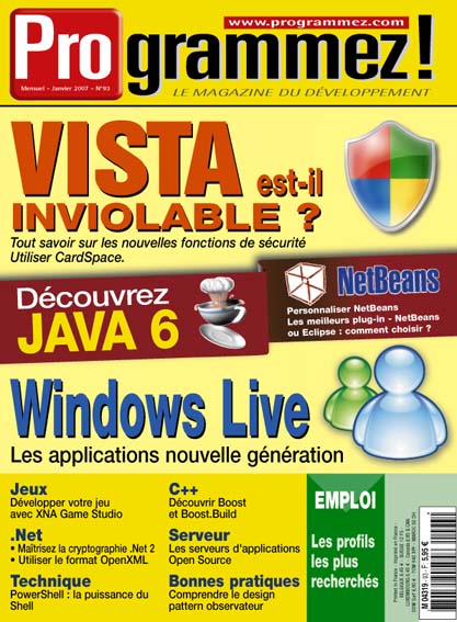 Dans programmez! PDF n° 93 Paru le 01/01/2007 S'ABONNER Evénements Microsoft Expression : des outils pour le Web Lire la suite de Microsoft Expression : des outils pour le Web Java 6, toujours dynamique Lire la suite de Java 6, toujours dynamique Les nouveautés Java 6 Lire la suite de Les nouveautés Java 6 Portrait JBuilder 2007 pointe son nez Lire la suite de JBuilder 2007 pointe son nez SGBD Base de données et goulets d’étranglement Lire la suite de Base de données et goulets d’étranglement Dossier Windows Live Oui Lire la suite de Windows Live Mon NetBeans idéal Lire la suite de Mon NetBeans idéal Projets Le SCM Perforce 2006.1 Lire la suite de Le SCM Perforce 2006.1 Sécurité Windows Vista : la sécurité revisitée Lire la suite de Windows Vista : la sécurité revisitée Les améliorations de la sécurité de Windows Vista Lire la suite de Les améliorations de la sécurité de Windows Vista Windows CardSpace : en route vers l’identité Lire la suite de Windows CardSpace : en route vers l’identité Carrière Employeurs cherchent candidats Lire la suite de Employeurs cherchent candidats Les profils et les salaires les plus recherchés : bilan d’une année exceptionnelle Lire la suite de Les profils et les salaires les plus recherchés : bilan d’une année exceptionnelle Développement Web Panorama des serveurs d’applications open source Lire la suite de Panorama des serveurs d’applications open source Technique A la découverte de PowerShell Lire la suite de A la découverte de PowerShell Code Faire de la cryptographie sous .Net Lire la suite de Faire de la cryptographie sous .Net OpenXML et .Net Oui Lire la suite de OpenXML et .Net Comprendre le Design Pattern Observateur Oui Lire la suite de Comprendre le Design Pattern Observateur Boostez votre code C++ Lire la suite de Boostez votre code C++ Boost.Build, un outil de construction de projets C et C++ Oui Lire la suite de Boost.Build, un outil de construction de projets C et C++ Temps libre Introduction à XNA Game Studio Express Oui Lire la suite de Introduction à XNA Game Studio Express