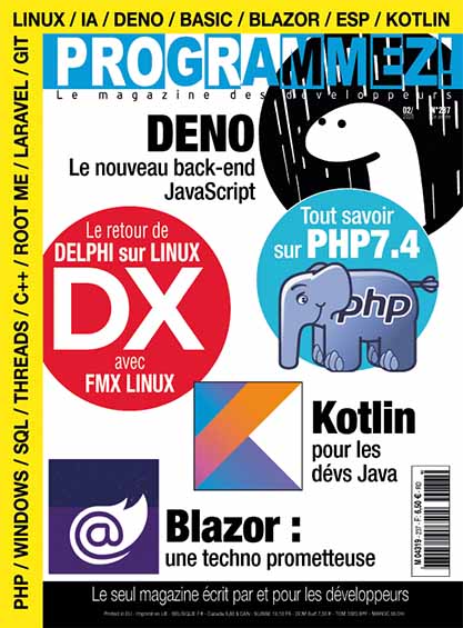 Dans programmez! papier n° 237 Paru le 31/01/2020 S'ABONNER Roadmap Roadmap des langages Lire la suite de Roadmap des langages Carrière La reconversion, c’est maintenant ! Lire la suite de La reconversion, c’est maintenant ! La Fintech Lemon Way, au coeur de l’innovation, recrute de nouveaux talents Lire la suite de La Fintech Lemon Way, au coeur de l’innovation, recrute de nouveaux talents Matériel Détection de visages avec le Maix Dock de SiPeed Lire la suite de Détection de visages avec le Maix Dock de SiPeed Langage La magie d’AOZ : le retour du Basic Lire la suite de La magie d’AOZ : le retour du Basic Sécurité Black Hat : Dino Dai Zovi, hacker émérite new-yorkais, milite pour la coopération et le DevSecOps Lire la suite de Black Hat : Dino Dai Zovi, hacker émérite new-yorkais, milite pour la coopération et le DevSecOps YesWeHack lance une plateforme de formation autour du Bug Bounty Lire la suite de YesWeHack lance une plateforme de formation autour du Bug Bounty Root Me : racine-moi si tu l’oses ! Lire la suite de Root Me : racine-moi si tu l’oses ! Linux Delphi revient sur Linux 1 Lire la suite de Delphi revient sur Linux Serveur Deno - Première approche 1 Lire la suite de Deno - Première approche Blazor Blazor Webassembly : l’autre Blazor 1 Lire la suite de Blazor Webassembly : l’autre Blazor Blazor vs Angular : vrai débat ou idées reçues ? Lire la suite de Blazor vs Angular : vrai débat ou idées reçues ? PHP (Re)découvrir PHP à travers Laravel Lire la suite de (Re)découvrir PHP à travers Laravel Les nouveautés de PHP 7.4 Lire la suite de Les nouveautés de PHP 7.4 Linux Back to basics : Systemd Lire la suite de Back to basics : Systemd Kotlin Kotlin pour les développeurs Java Lire la suite de Kotlin pour les développeurs Java Git Apprendre GIT en ligne de commande dans Visual Studio 2019 et GitHub Lire la suite de Apprendre GIT en ligne de commande dans Visual Studio 2019 et GitHub Maker ESP32, Mongoose OS et GCP Cloud IoT Core : un trio efficace et sûr pour l’IoT Lire la suite de ESP32, Mongoose OS et GCP Cloud IoT Core : un trio efficace et sûr pour l’IoT Linux Développer sous Linux depuis une machine Windows 10 ! 1 Lire la suite de Développer sous Linux depuis une machine Windows 10 ! Architecture Découplez vos applications avec l’architecture hexagonale Lire la suite de Découplez vos applications avec l’architecture hexagonale SQL Le SQL avancé pour de vraies performances 1 Lire la suite de Le SQL avancé pour de vraies performances Test Les tests d'intégration facile avec Venom ! Lire la suite de Les tests d'intégration facile avec Venom ! Architecture Contour, un proxy pour Kubernetes 1 Lire la suite de Contour, un proxy pour Kubernetes Java L’essentiel des threads pour comprendre les phénomènes de concurrence Lire la suite de L’essentiel des threads pour comprendre les phénomènes de concurrence C++ Windows : faire un menu Démarrer en C++ 1 Lire la suite de Windows : faire un menu Démarrer en C++