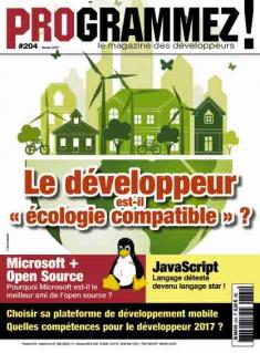 Dans programmez! PDF n° 204 Paru le 03/02/2017 S'ABONNER Ecologie Le développeur est-il « écologie-compatible » Lire la suite de Le développeur est-il « écologie-compatible » Développement = écologie-compatible Lire la suite de Développement = écologie-compatible Matériel CES 2017 : des robots et objets pour apprendre à la fois la robotique et à coder Lire la suite de CES 2017 : des robots et objets pour apprendre à la fois la robotique et à coder VR CHRONIQUE : LA VR OU MIXTE, QUELLE RÉALITÉ MARCHÉ ? Lire la suite de CHRONIQUE : LA VR OU MIXTE, QUELLE RÉALITÉ MARCHÉ ? CES 2017 : la part belle à la réalité virtuelle et à la réalité augmentée Lire la suite de CES 2017 : la part belle à la réalité virtuelle et à la réalité augmentée NAVIGATEURS, LANGAGES, MIDDLEWARES… QUELLE EST LA PART DE CONSOMMATION ? Lire la suite de NAVIGATEURS, LANGAGES, MIDDLEWARES… QUELLE EST LA PART DE CONSOMMATION ? Carrière L’obsolescence des compétences : informaticiens, attention pour votre carrière Lire la suite de L’obsolescence des compétences : informaticiens, attention pour votre carrière Les compétences 2017 : notre horoscope Lire la suite de Les compétences 2017 : notre horoscope JS JavaScript : des origines à NodeJS Lire la suite de JavaScript : des origines à NodeJS Geekulture Histoire & futur de l'informatique Épisode 2 Lire la suite de Histoire & futur de l'informatique Épisode 2 Microsoft aime Linux Microsoft aime Linux Lire la suite de Microsoft aime Linux Open Source & Azure Lire la suite de Open Source & Azure .Net Standard 2.0 et son utilisation dans les projets .NET Lire la suite de .Net Standard 2.0 et son utilisation dans les projets .NET Vcpkg, un outil pour acquérir et compiler plus simplement les librairies open source C++ sur Windows Lire la suite de Vcpkg, un outil pour acquérir et compiler plus simplement les librairies open source C++ sur Windows Data MODÉLISATION DES DONNÉES Partie 4 Quels intérêts et usages pour le reverse engineering ? Lire la suite de MODÉLISATION DES DONNÉES Partie 4 Quels intérêts et usages pour le reverse engineering ? Azure Service Fabric : une plateforme PaaS sous stéroïdes Partie 1 Lire la suite de Service Fabric : une plateforme PaaS sous stéroïdes Partie 1 Web Les Progressive Web Apps Partie 2 La seconde chance du Web dans l’univers du mobile Lire la suite de Les Progressive Web Apps Partie 2 La seconde chance du Web dans l’univers du mobile Exploser des pixels avec WebGL et JavaScript Partie 2 1 Lire la suite de Exploser des pixels avec WebGL et JavaScript Partie 2 GitHub Découvrir GitHub Partie 2 Lire la suite de Découvrir GitHub Partie 2 Mobile Développement mobile : choisir, et si possible bien choisir Lire la suite de Développement mobile : choisir, et si possible bien choisir Développement mobile : quelles solutions, comment choisir, quel outil pour quel développement ? Lire la suite de Développement mobile : quelles solutions, comment choisir, quel outil pour quel développement ? Projet mobile Simple CRM, questions – réponses avec Brice Cornet Lire la suite de Projet mobile Simple CRM, questions – réponses avec Brice Cornet Pourquoi (choisir) Xamarin ? Lire la suite de Pourquoi (choisir) Xamarin ? Créez des applications multi-plateformes pour Android et iOS avec Flutter 1 Lire la suite de Créez des applications multi-plateformes pour Android et iOS avec Flutter Delphi et le développement mobile Questions – réponses avec Florian LOUIS, chef de projets R&D chez Ginkoia Lire la suite de Delphi et le développement mobile Questions – réponses avec Florian LOUIS, chef de projets R&D chez Ginkoia Sécurité DevOps Rugged : intégration dans le pipeline CI Lire la suite de DevOps Rugged : intégration dans le pipeline CI Langage Introduction à Rust Partie 3 1 Lire la suite de Introduction à Rust Partie 3 Maker EmbedXcode : comment programmer un Arduino à l’aide d’Xcode sous Mac 1 Lire la suite de EmbedXcode : comment programmer un Arduino à l’aide d’Xcode sous Mac Vintage Atari ST : Overscan Lire la suite de Atari ST : Overscan