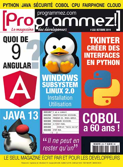 Dans programmez! PDF n° 233 Paru le 27/09/2019 S'ABONNER Roadmap Roadmap des langages Lire la suite de Roadmap des langages Cloud Comment Nutanix Calm facilite la mise en place des pipelines CI/CD Lire la suite de Comment Nutanix Calm facilite la mise en place des pipelines CI/CD GUI Air interface : la révolution de l’interface et de l’ergonomie Lire la suite de Air interface : la révolution de l’interface et de l’ergonomie Matériel Fairphone 3, le téléphone modulaire et réparable : réalité ou simple promesse ? Lire la suite de Fairphone 3, le téléphone modulaire et réparable : réalité ou simple promesse ? Formation Formation tout au long de la vie d’un informaticien : le mentorat Lire la suite de Formation tout au long de la vie d’un informaticien : le mentorat Cobol Cobol : toujours d’actualité ! Lire la suite de Cobol : toujours d’actualité ! Cobol : 60 ans et toujours en forme Lire la suite de Cobol : 60 ans et toujours en forme L’automatisation et les outils modernes boostent l’efficacité des développeurs mainframe Lire la suite de L’automatisation et les outils modernes boostent l’efficacité des développeurs mainframe Comment Openframe veut sortir le mainframe du monolithique ? Lire la suite de Comment Openframe veut sortir le mainframe du monolithique ? Nouveauté Quoi de neuf Angular ? Lire la suite de Quoi de neuf Angular ? Windows Subsystem for Linux 2 (WSL2) Lire la suite de Windows Subsystem for Linux 2 (WSL2) Java 13 : une version principalement technique Lire la suite de Java 13 : une version principalement technique Les nouveautés d’ASP.NET Core 3, à la découverte de gRPC Lire la suite de Les nouveautés d’ASP.NET Core 3, à la découverte de gRPC CPU La vectorisation dans les CPU modernes Lire la suite de La vectorisation dans les CPU modernes Python Réaliser un Mastermind avec Tkinter 1 Lire la suite de Réaliser un Mastermind avec Tkinter Mobile Une application mobile intelligente avec Azure Machine Learning Studio et Xamarin 1 Lire la suite de Une application mobile intelligente avec Azure Machine Learning Studio et Xamarin Java Arthas : l’outil de diagnostics d’Alibaba Lire la suite de Arthas : l’outil de diagnostics d’Alibaba Craft Man versus Legacy : Gilded Rose 1 Lire la suite de Man versus Legacy : Gilded Rose Cloud Architecture Serverless : de la Théorie à la pratique 3/3 Lire la suite de Architecture Serverless : de la Théorie à la pratique 3/3