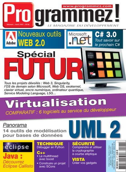 Dans programmez! PDF n° 96 Paru le 01/04/2007 S'ABONNER Evénements Adobe prépare ses gammes 2007 Lire la suite de Adobe prépare ses gammes 2007 Interactivité L’actualité programmez.com Lire la suite de L’actualité programmez.com Projets La virtualisation investit l’applicatif : la méthode BEA Lire la suite de La virtualisation investit l’applicatif : la méthode BEA Accéder au mainframe avec C#/.Net Lire la suite de Accéder au mainframe avec C#/.Net Vista Les Gadgets pour Windows Vista Lire la suite de Les Gadgets pour Windows Vista Dossier L’avenir de l’informatique et du développement Lire la suite de L’avenir de l’informatique et du développement Langage du futur : l’avenir radieux pour Goto++ Lire la suite de Langage du futur : l’avenir radieux pour Goto++ Développeurs : virtualisez votre environnement ! Lire la suite de Développeurs : virtualisez votre environnement ! Panorama UML 2 pour les bases de données Oui Lire la suite de UML 2 pour les bases de données Technique Partage mémoire entre Java et C++ Lire la suite de Partage mémoire entre Java et C++ Carrière La pénurie guette le secteur des développeurs Web Lire la suite de La pénurie guette le secteur des développeurs Web Sécurité Cryptographie à l’aide de courbes elliptiques Lire la suite de Cryptographie à l’aide de courbes elliptiques Code Nouveautés de C# 3.0 Lire la suite de Nouveautés de C# 3.0 Mes débuts en WPF 2e partie Lire la suite de Mes débuts en WPF 2e partie CALLISTO : Le satellite d’Eclipse Lire la suite de CALLISTO : Le satellite d’Eclipse SCons, le couteau suisse des outils de construction de projets Lire la suite de SCons, le couteau suisse des outils de construction de projets Techniques de débogage pour Python Lire la suite de Techniques de débogage pour Python La programmation multithread en C++ avec Boost Lire la suite de La programmation multithread en C++ avec Boost Ludique Jeux et multimédia : les mobiles comme les grands Lire la suite de Jeux et multimédia : les mobiles comme les grands