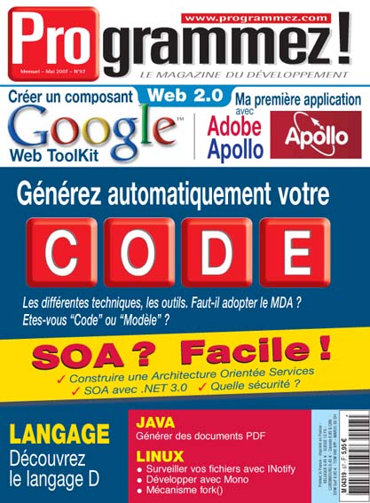 Dans programmez! PDF n° 97 Paru le 01/05/2007 S'ABONNER Evénements Sun : la machine virtuelle Java devient multi langage ! Lire la suite de Sun : la machine virtuelle Java devient multi langage ! Test Adobe Creative Suite 3 Web Premium Lire la suite de Adobe Creative Suite 3 Web Premium Projets Les meilleures pratiques du développement des logiciels libres Lire la suite de Les meilleures pratiques du développement des logiciels libres SGBD Synchronisation avec ADO.net Lire la suite de Synchronisation avec ADO.net Gros Plan Le langage D : votre prochain langage Lire la suite de Le langage D : votre prochain langage Dossier Génération de code Lire la suite de Génération de code SOA facile Lire la suite de SOA facile L’expertise C++ pilotée par le modèle UML Lire la suite de L’expertise C++ pilotée par le modèle UML UML pour la cartographie et SOA Lire la suite de UML pour la cartographie et SOA Technique Le débogage avec Visual Studio Lire la suite de Le débogage avec Visual Studio Développement Web Ma première application Apollo Lire la suite de Ma première application Apollo Construire un composant " glisser - déposer " avec Google Web Toolkit (1re Partie) Lire la suite de Construire un composant " glisser - déposer " avec Google Web Toolkit (1re Partie) Code Mécanisme du fork() avec l’EDI Code::Blocks Oui Lire la suite de Mécanisme du fork() avec l’EDI Code::Blocks Premiers pas avec Mono sous Linux Lire la suite de Premiers pas avec Mono sous Linux Mes débuts en WPF 3e partie : la 3D Lire la suite de Mes débuts en WPF 3e partie : la 3D Générez vos documents PDF et RTF avec Java Oui Lire la suite de Générez vos documents PDF et RTF avec Java Surveillez vos fichiers sous Linux avec INotify Oui Lire la suite de Surveillez vos fichiers sous Linux avec INotify